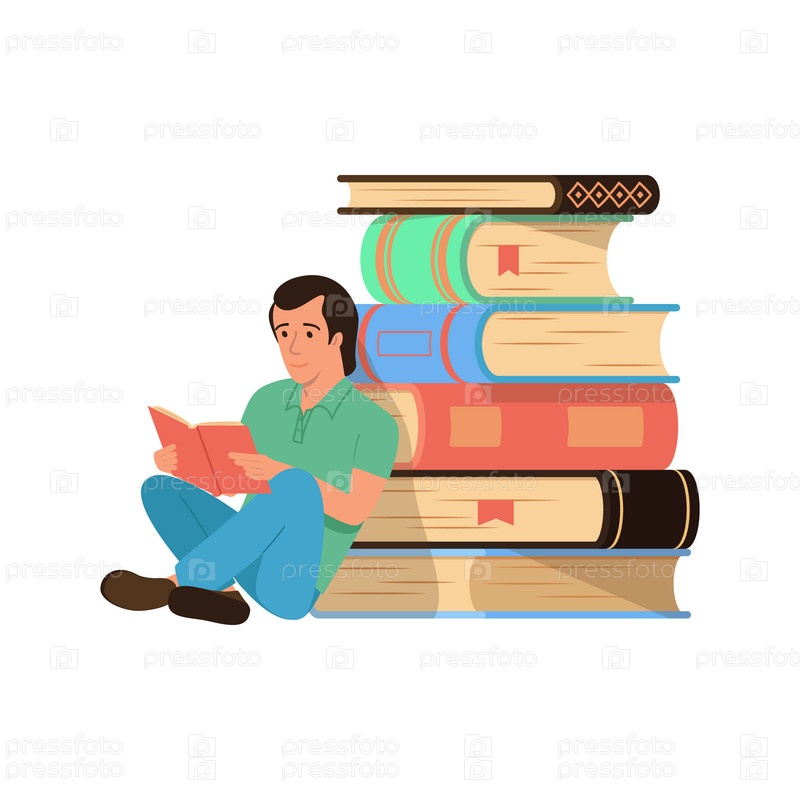 Стопка книг и сидящий читающий человек. Концепция образования, отдыха, чтения. Цветная векторная иллюстрация плоского стиля