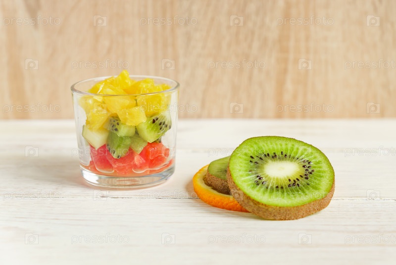 Диета Свежий вкусный фруктовый салат в стеклянной банке на деревянном столе. Нарезанные сочные апельсины, киви и грейпфруты
