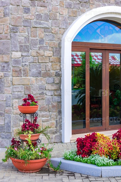 Патио. Кирпичная стена с большим окном, украшенным красивыми цветами