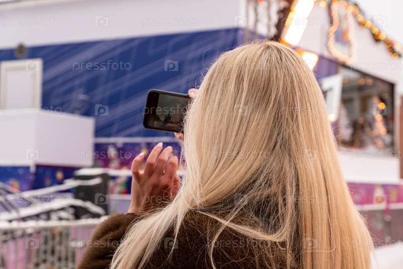 МОСКВА, РОССИЯ - 15 ДЕКАБРЯ 2020 г.: Светловолосая женщина фотографирует праздничное украшение Москвы на свой смартфон на Красной площади