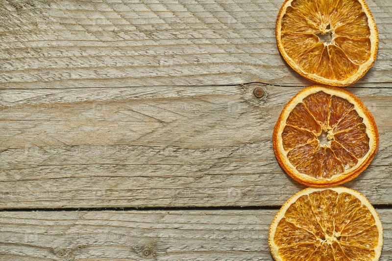 Три сушеных апельсиновых дольки на деревянном фоне, вид сверху, пространство для копирования