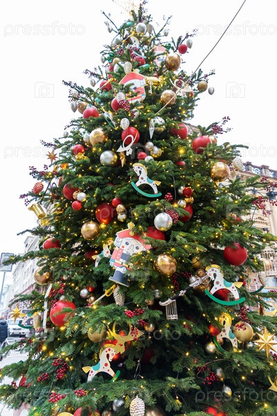 Закройте украшение елки игрушками и гирляндами. Праздничный декор города во время зимних праздников