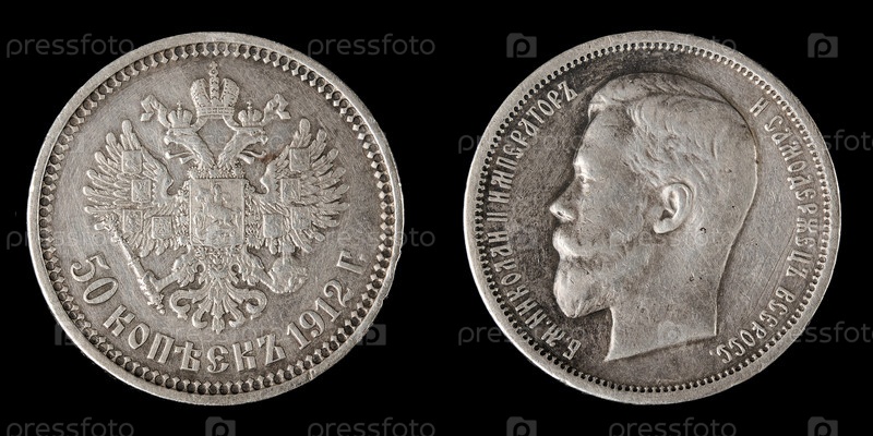 Серебряная монета 50 копеек Императора Николая второго на черном фоне