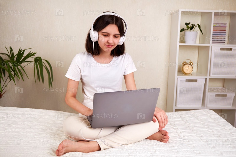 Молодая девочка-подросток в наушниках слушает музыку, работает на ноутбуке