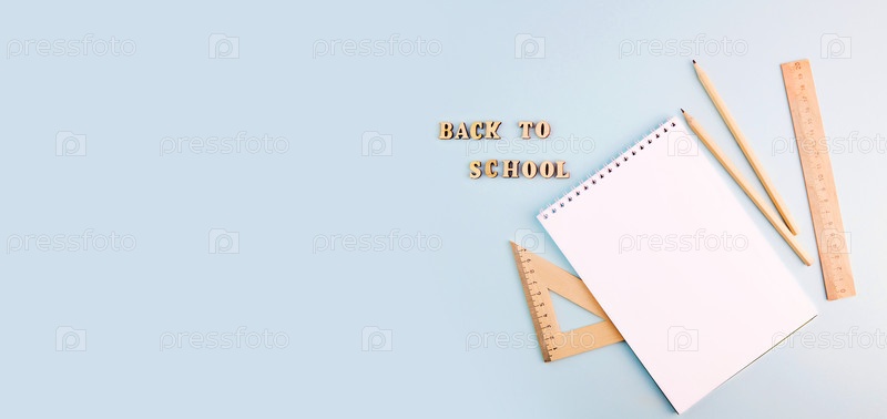 Школьные принадлежности: пустая тетрадь, деревянные карандаши и линейки