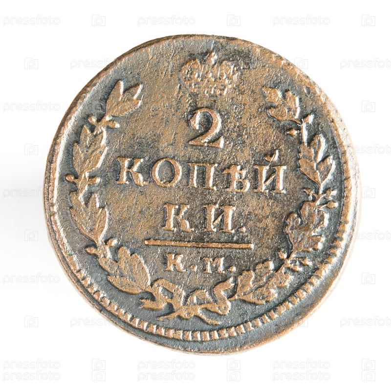 Медная монета российской империи на белом фоне