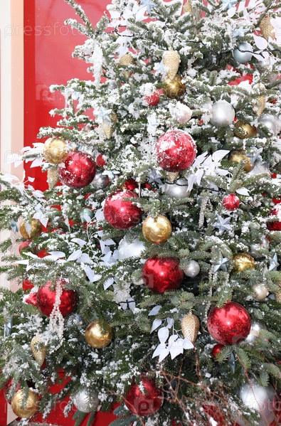 Рождественская украшенная елка с шарами и снегом