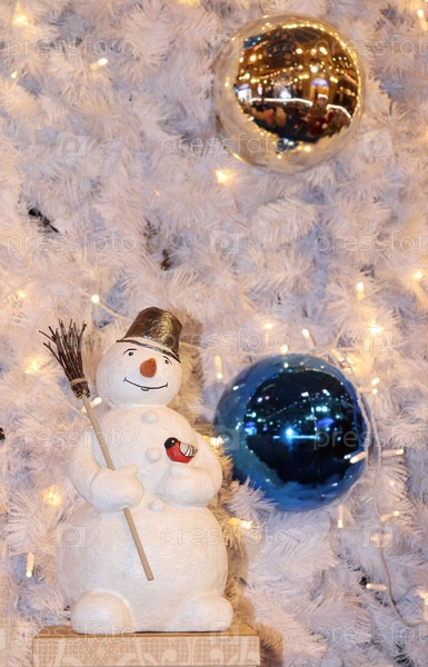 Снеговик на фоне елки с шарами