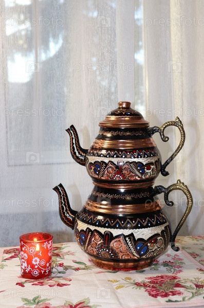Турецкий чайник и свеча на фоне окна