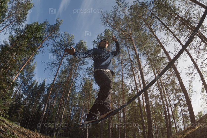 Мужчина идет по слэклайну в живописном сосновом лесу