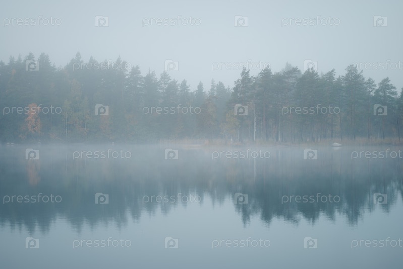 Зеркальная гладь лесного озера туманным осенним утром