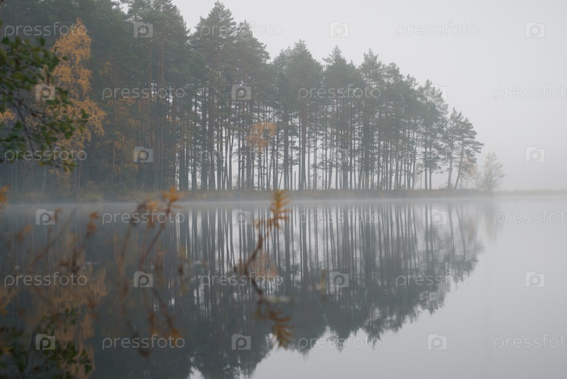 Лесистый мыс на лесном озере. Туманное осеннее утро