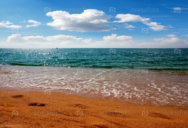 Красивый песчаный пляж средиземного моря и солнечное небо
