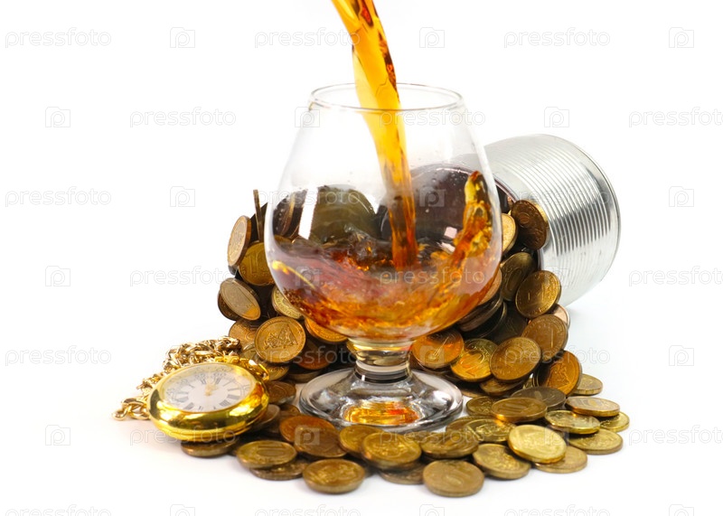 Стакан крепкого алкогольного напитка в куче монет и старых рождественских часах