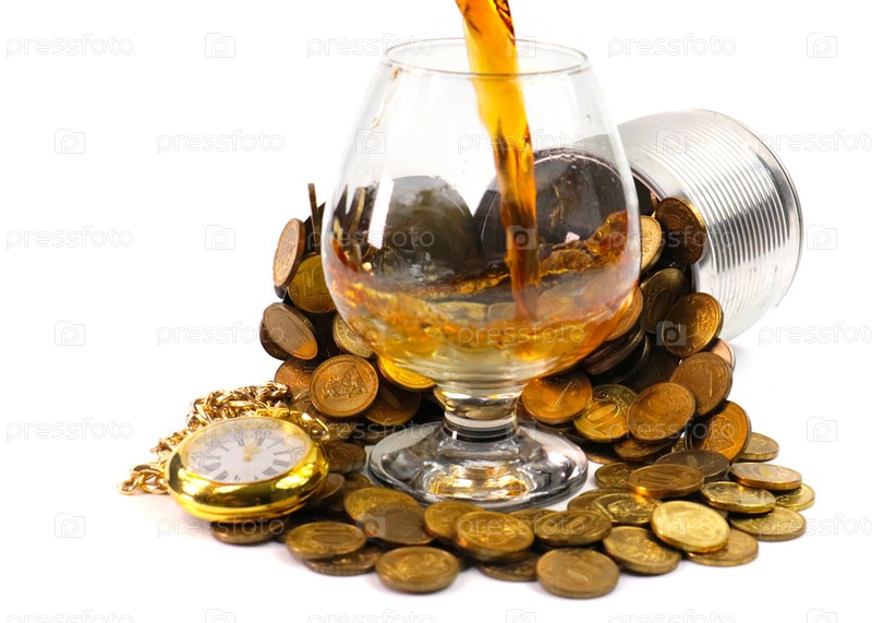 Стакан крепкого алкогольного напитка в куче монет и старых рождественских часах