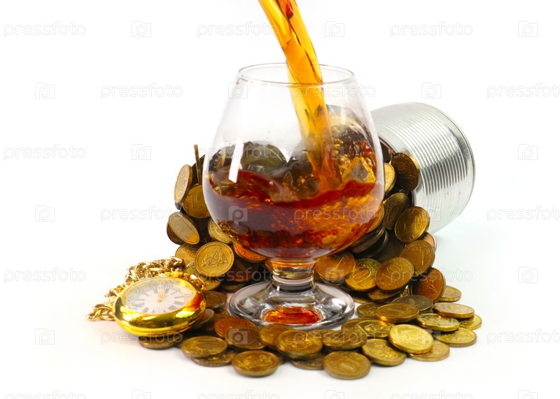 Стакан крепкого алкогольного напитка в куче монет и старых рождественских часах