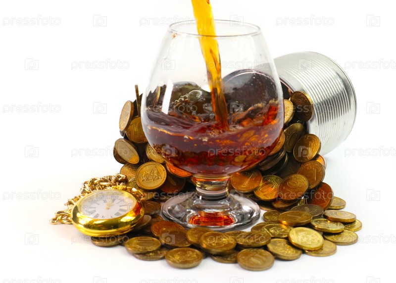 Стакан крепкого алкогольного напитка в куче монет и старых рождественских часах