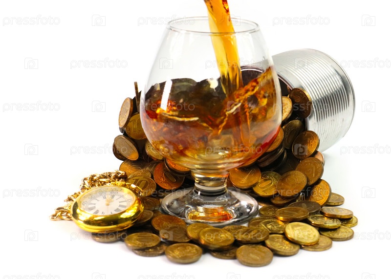 Стакан крепкого алкогольного напитка в куче монет и старых рождественских часах
