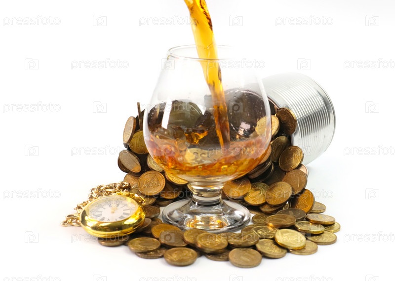 Стакан крепкого алкогольного напитка в куче монет и старых рождественских часах