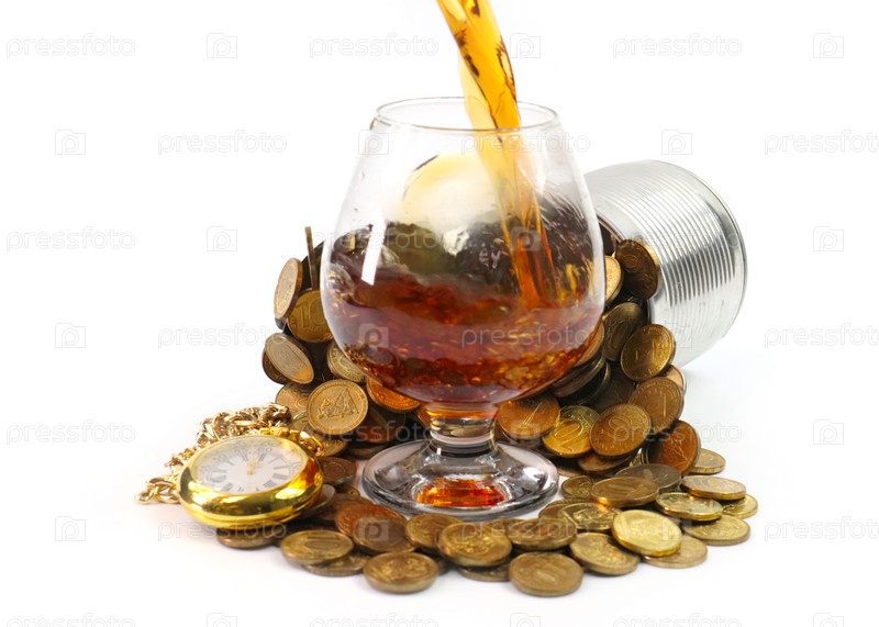 Стакан крепкого алкогольного напитка в куче монет и старых рождественских часах