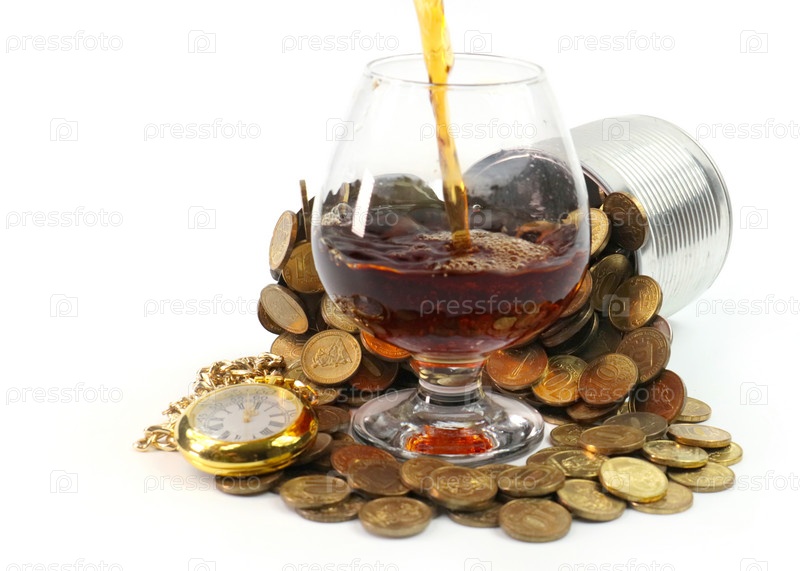 Стакан крепкого алкогольного напитка в куче монет и старых рождественских часах