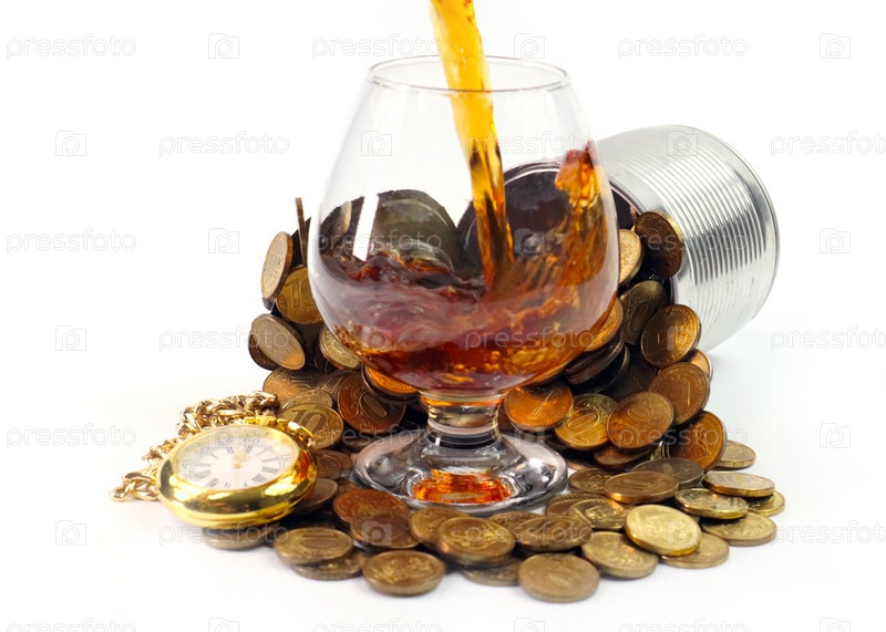 Стакан крепкого алкогольного напитка в куче монет и старых рождественских часах