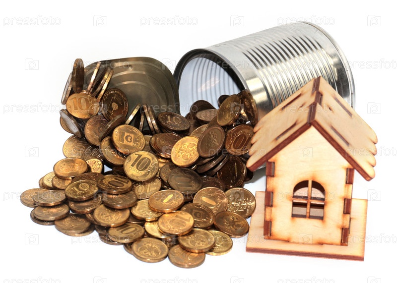 Куча русских монет лежит в металлической консервной банке рядом с деревянным домом в качестве ипотечного кредитования