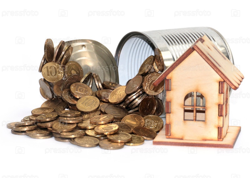 Куча русских монет лежит в металлической консервной банке рядом с деревянным домом в качестве ипотечного кредитования