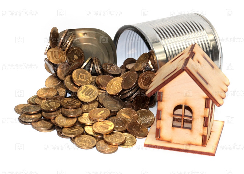 Куча русских монет лежит в металлической консервной банке рядом с деревянным домом в качестве ипотечного кредитования