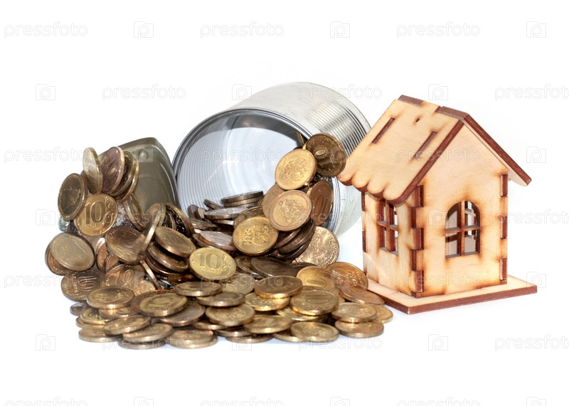 Куча русских монет лежит в металлической консервной банке рядом с деревянным домом в качестве ипотечного кредитования