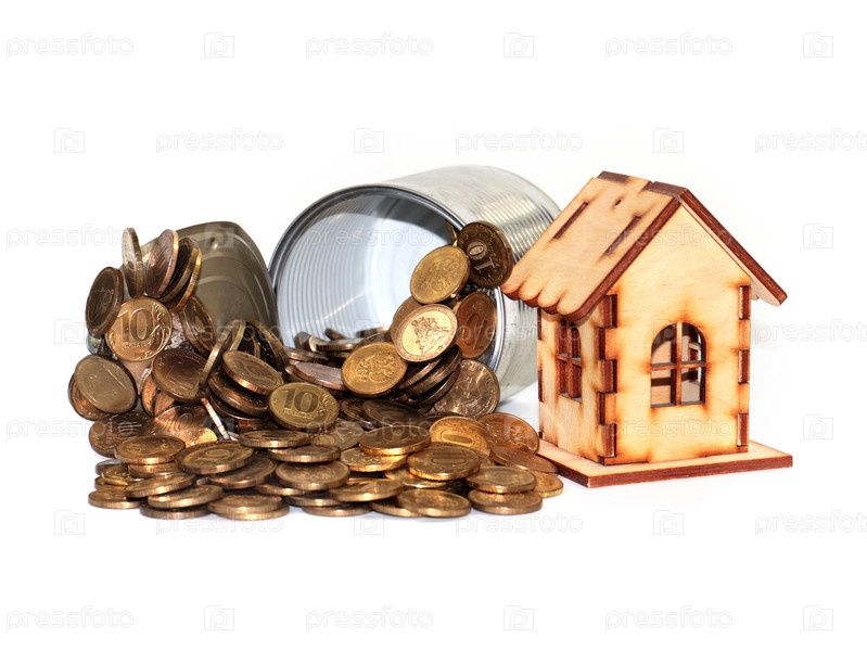 Куча русских монет лежит в металлической консервной банке рядом с деревянным домом в качестве ипотечного кредитования