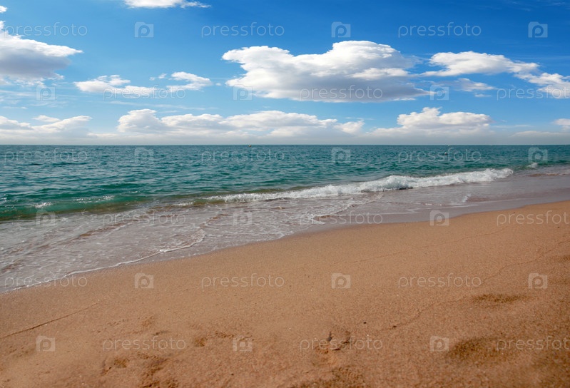 Красивый песчаный пляж средиземного моря и солнечное небо