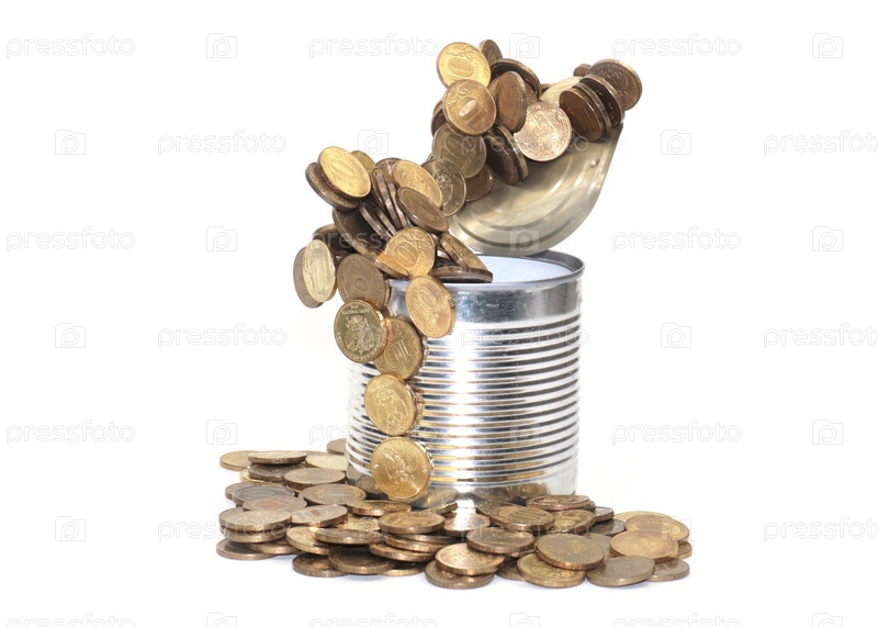 Металлические российские монеты рубли в жестяной банке как элемент накопления средств