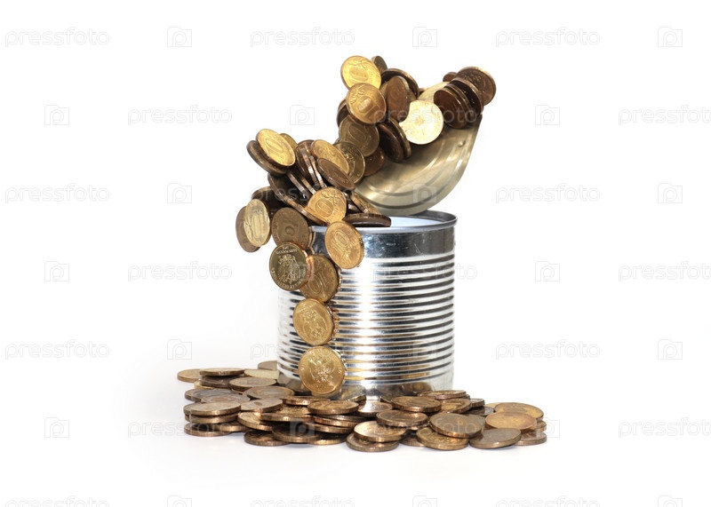 Металлические российские монеты рубли в жестяной банке как элемент накопления средств
