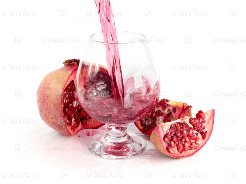 Струйка гранатового сока в стакан и кусочки спелого яркого граната
