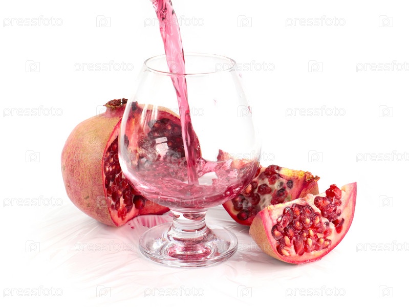 Струйка гранатового сока в стакан и кусочки спелого яркого граната