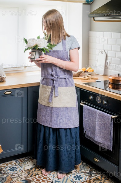 Счастливая женщина в льняном фартуке стоит на кухне и нюхает букет белых пионов