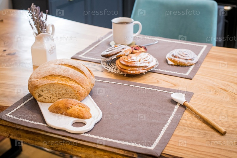 Свежая буханка хлеба, сладкие булочки и чашка кофе лежали на льняном полотенце на деревянном столе