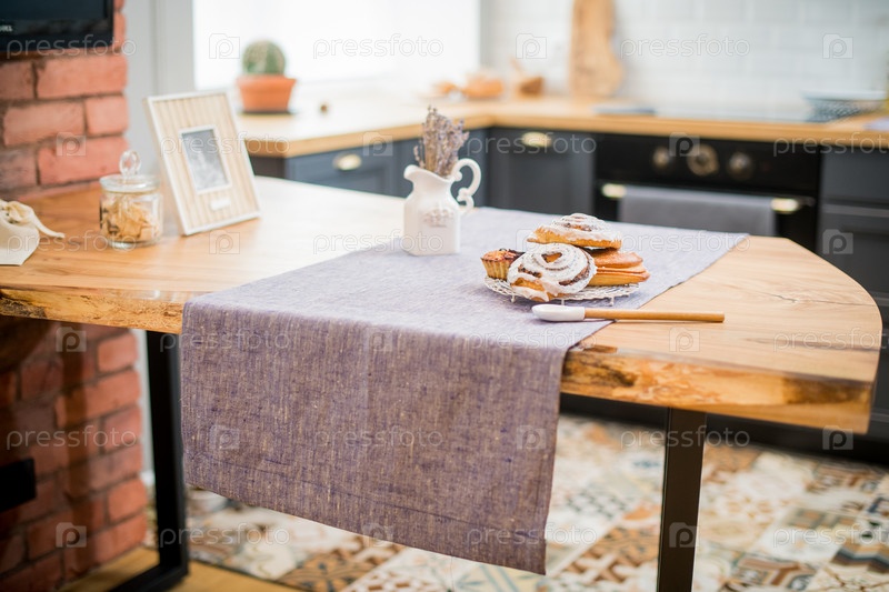 Сладкие свежие булочки лежат на тарелке на деревянном кухонном столе на льняной салфетке
