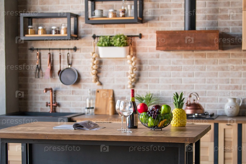 Чашка и пирожные на тарелке, бокалы, бутылка вина и фруктовая подставка на столе на фоне интерьера кухни