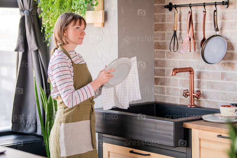 Счастливая женщина в льняном фартуке стоит на кухне у раковины и вытирает тарелку льняным полотенцем
