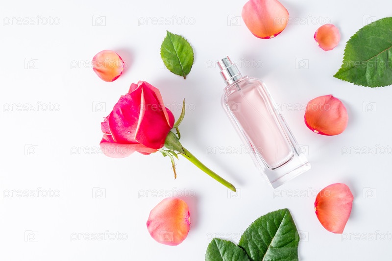 Плоская кладка флакона женских духов с цветочным ароматом и лепестками роз. белый фон. вид сверху. пустой макет бутылки