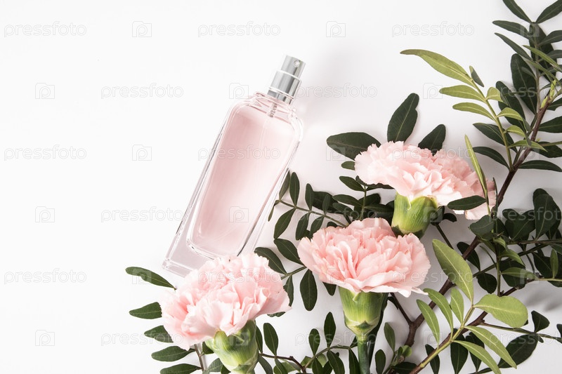 Шикарный флакон женских духов или парфюмированной воды на белом фоне среди красивых розовых гвоздик и зеленых веточек. копирайт