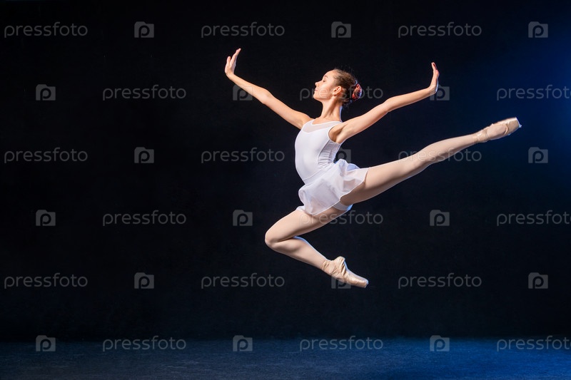 Балерина в белом платье летит в прыжке на черном фоне