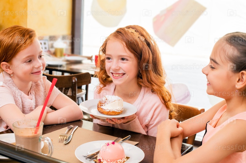 Три маленькие девочки, сидящие за столиком в кафе, весело пьют горячий шоколад и едят пирожные