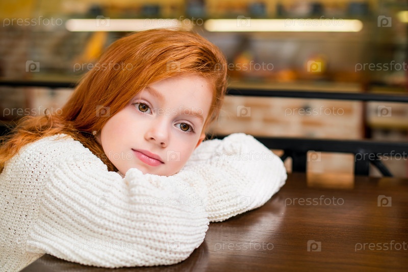 Портрет маленькой рыжеволосой девочки, ожидающей в одиночестве за столиком в кафе