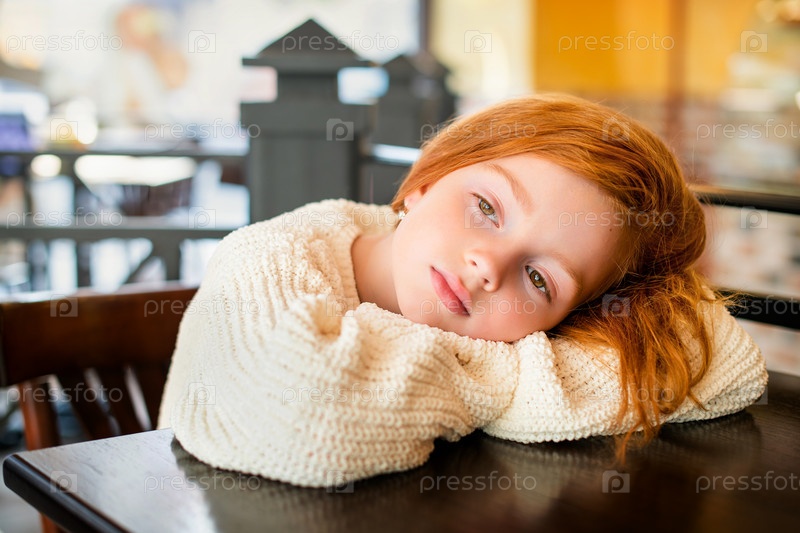 Портрет маленькой рыжеволосой девочки, ожидающей в одиночестве за столиком в кафе