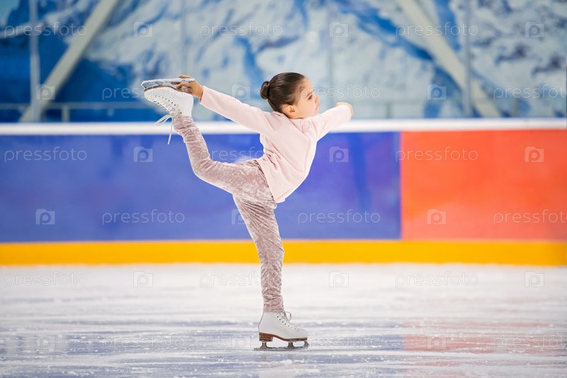 Маленькая фигуристка в светло-розовом спортивном костюме с улыбкой катается по льду на крытом катке