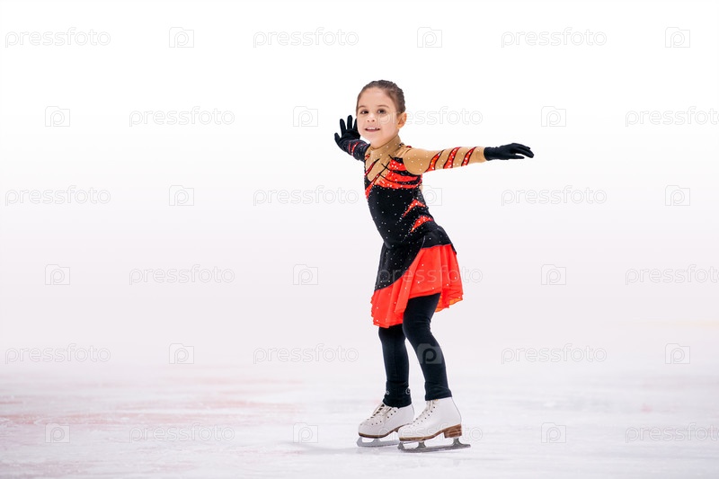 Маленькая фигуристка в красном черном красивом платье с улыбкой катается на коньках по льду на крытом катке