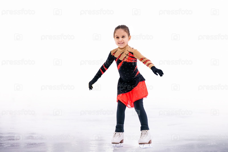 Маленькая фигуристка в красном черном красивом платье с улыбкой катается на коньках по льду на крытом катке